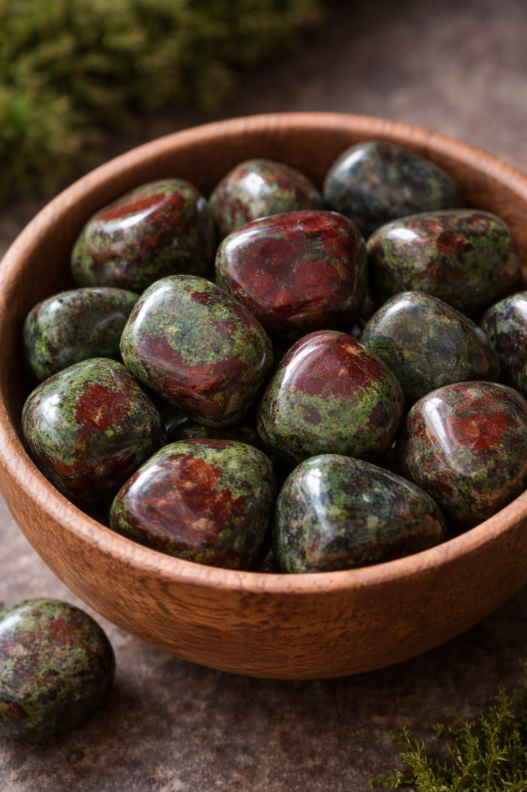 Reconnaissable à ses nuances de vert profond mêlées de rouge, il est souvent associé à l’énergie du dragon : ancrée, courageuse et protectrice.