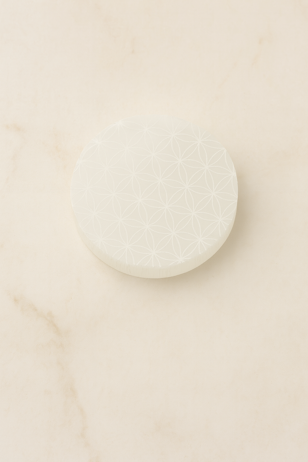 Purifiez et rechargez vos cristaux avec élégance grâce à cette plaque de charge en sélénite gravée du symbole sacré de la Fleur de Vie.